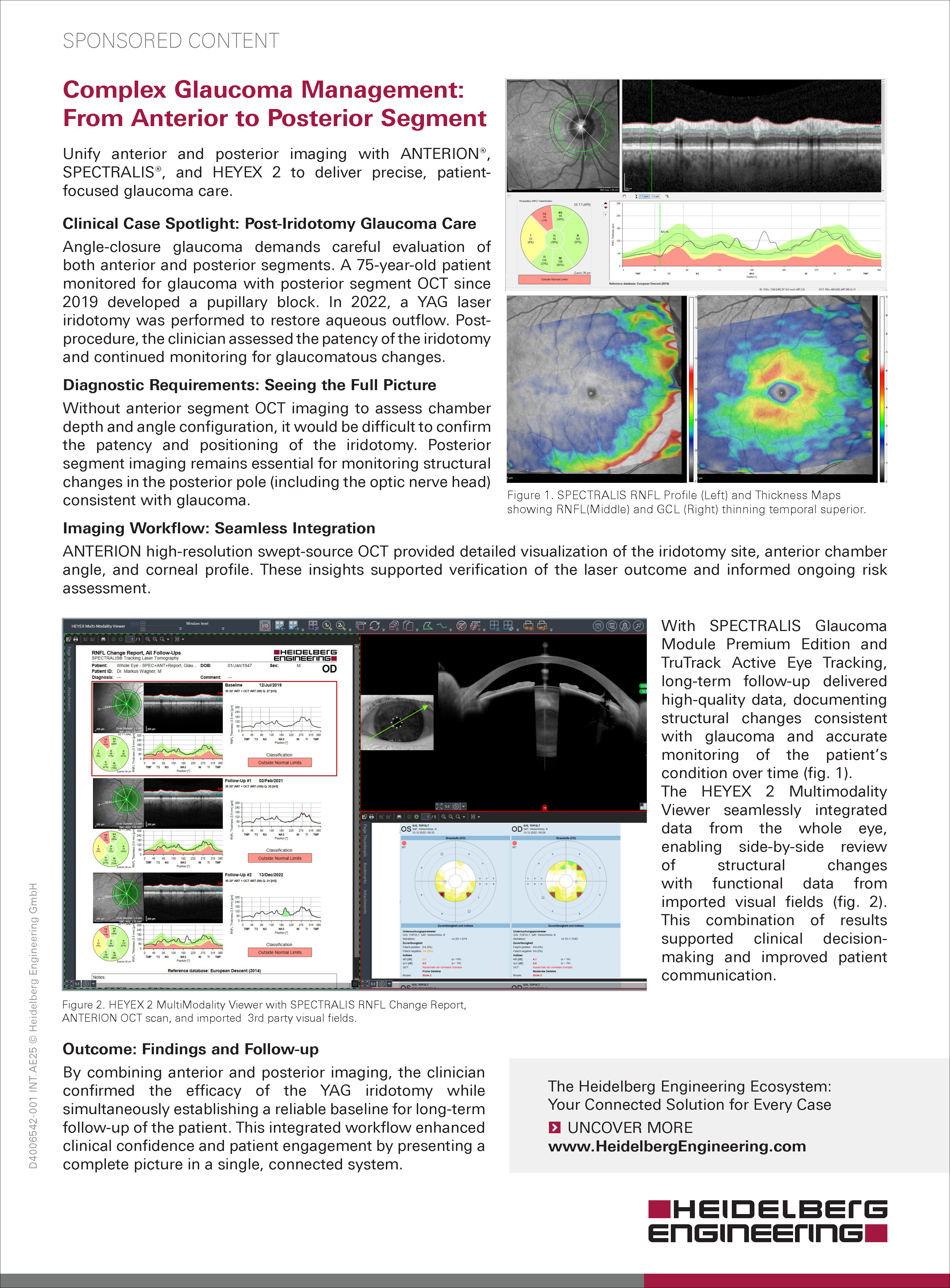 A 75-year-old patient with angle-closure glaucoma developed pupillary block and underwent YAG iridotomy. Comprehensive imaging of both the anterior chamber and posterior pole was essential to help confirm iridotomy patency, assess angle configuration and monitor long-term structural changes consistent with glaucoma.